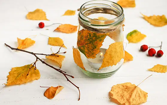 - réaliser une petite guirlande de feuilles d’automne et l’entortiller autour de l’anse de votre lampion suspendu…